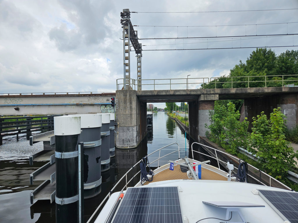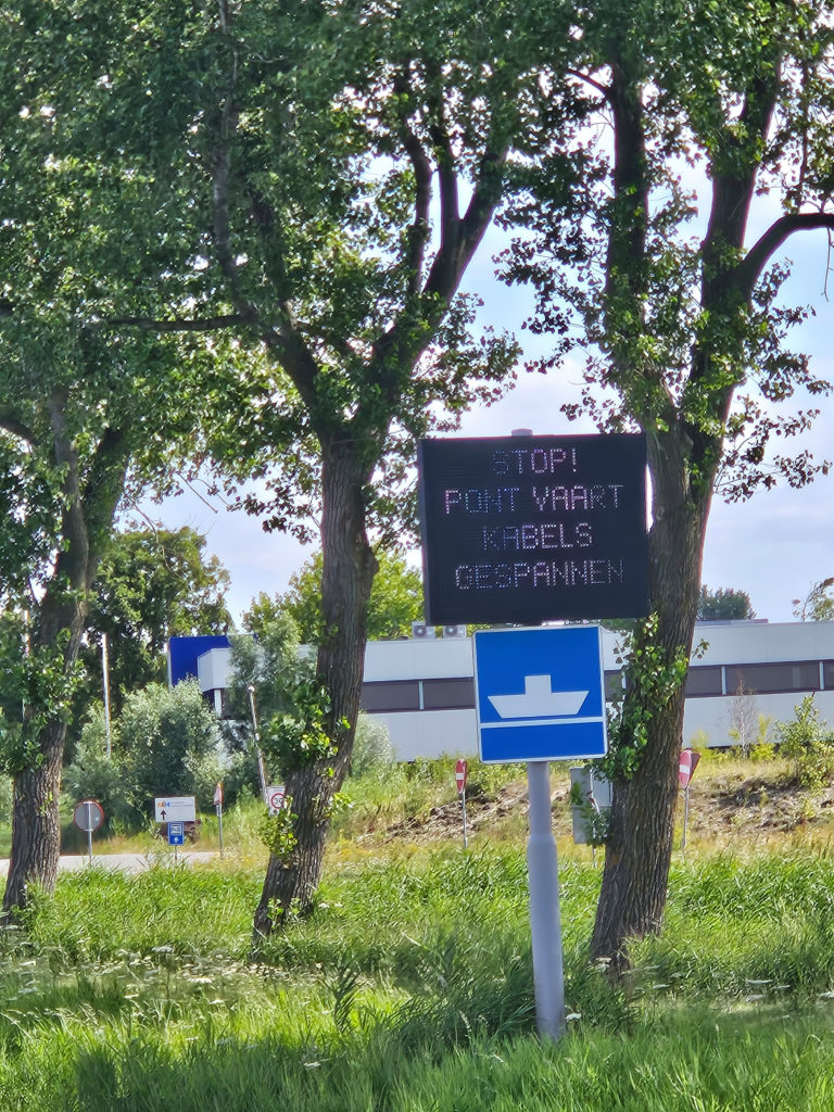 En poursuivant notre route sur le Noordhollandsch Kanaal, nous passons sous un pont très étroit, manœuvre qui demande toute notre attention. Nous devons patienter quelques minutes le temps qu’un ferry à câble ait terminé sa traversée. La circulation est bien réglée, mais l’espace reste limité — typique de la navigation sur les canaux hollandais, où la précision et la patience sont de mise.